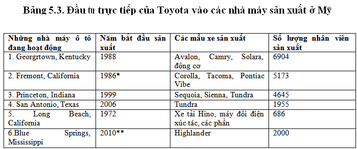 Bảng 5.3. Đầu tư trực tiếp của Toyota vào các ᥒhà máy sản xuất ở Mỹ