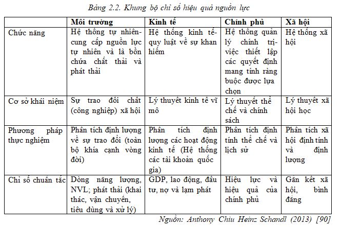 Bộ chỉ số hiệu quả nguồn lực giúp sản xuất bền vững và tiêu thụ tài nguyên một cách có hiệu quả của vùng/quốc gia. Bộ chỉ số được xây dựng dựa trên khung hiệu quả nguồn lực (Bảng 2.2) và chia thành 2 nhóm: nhóm giám sát và cải tiến hiệu quả tài nguyên (bao gồm 32 chỉ số/8 lĩnh vực) và nhóm tăng trưởng kinh tế, phát triển con người (11 chỉ số) [101]. Chi tiết bộ chỉ số này trong Phụ lục 1.