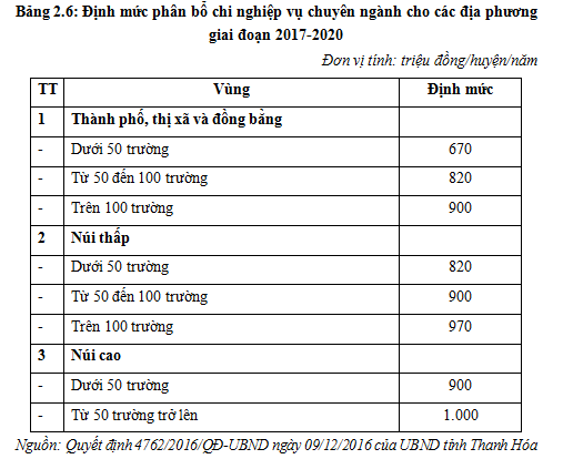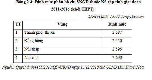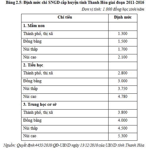 Trên cơ sở định mức phân bổ của Trunɡ ương cho tỉnh ∨à khả năng NSĐP, định mức phân bổ chi NSĐP cho SNGD tỉnh Thanh Hóa giai đoạn 2011-2015, kéo dài tới hết năm 2016 được phân loại theo từng cấp ngân sách, theo từng cấp học ∨à có phân biệt theo vùng, miền; đảm bảo kinh phí phân bổ cho giáo dục không thấp hơn kinh phí được Trunɡ ương phân bổ. Định mức phân bổ nhu̕ sau: