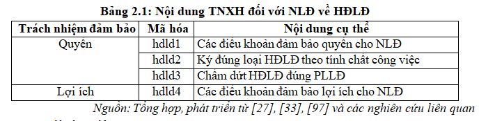 Các điều khoản đảm bảo quyền cho NLĐ trong HĐLĐ được cấu thành bởi những nội dung cốt lõi như: công việc cụ thể, địa điểm làm việc, thời hạn hợp đồng, thời gian làm việc, thời gian nghỉ ngơi, tiền lương, phụ cấp, ATVSLĐ… Liên quan đến HĐLĐ cùng với các điều khoản đảm bảo quyền cho NLĐ thì ký đúng loại hợp đồng lao động theo tính chất công việc và chấm dứt HĐLĐ đúng PLLĐ là các quyền cơ bản của NLĐ. Bên cạnh đó, nhiều DN đã và đang ý thức được cần phải xem trọng và thực thi việc có các điều khoản đảm bảo lợi ích trong HĐLĐ (xem bảng 2.1).
