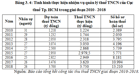 Mặc dù, có nhiều khó khăn về quản lý đối tượng và địa bàn, song Cục thuế TP.HCM đã có nhiều nỗ lực để thực hiện kế hoạch thu thuế TNCN. Bảng 3.4 phản ánh kết quả thực hiện dự toán thu thuế TNCN trong giai đoạn 2010- 2018.