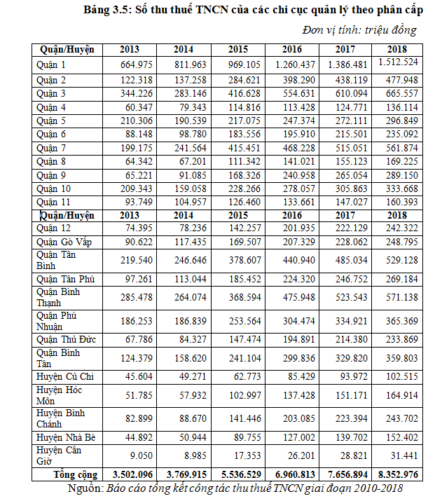 Từ Bảng 3.4 ta thấy: số thu thuế TNCN thực hiện qua các năm từ 2010 đến năm 2018 đều đạt và vượt dự toán thu thuế TNCN. Kết quả này được xem là rất tích cực, đặc biệt trong bối cảnh khó khăn về nhân sự (liên tục giảm từ 31 còn 26 công chức từ năm 2010 đến năm 2018). Đồng thời, khối lượng công việc lại tăng gần gấp 5,5 lần trong cùng giai đoạn này từ 2.300 hồ sơ hoàn thuế năm 2010 lên hơn 13.000 hồ sơ năm 2018.