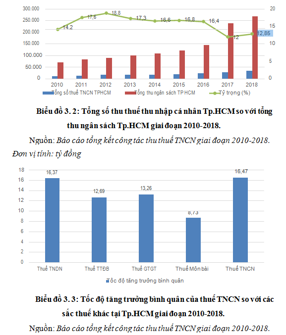 Nhìn chung, công tác quản lý thuế TNCN tại Tp. HCM đã đạt những kết quả tốt, từng bước nâng cao nhận thức của NNT đối với thuế TNCN. Giai đoạn 2010-2018, nguồn thu từ thuế TNCN đóng góp lớn trong tổng thu ngân sách tại Tp.HCM, trong đó năm 2012 thì thuế TNCN đóng góp cao nhất là 18,8% tổng thu ngân sách toàn thành phố. Năm 2018, thuế TNCN có tỷ trọng đóng góp cao thứ 3 trong các sắc thuế, chỉ sau thuế thu TNDN và thuế GTGT, chiếm 12,85% tổng thu ngân sách toàn thành phố, đạt 34.584,92 tỷ đồng. Tuy nhiên, tốc độ tăng trưởng bình quân của thuế TNCN là 16,47%/năm nhiều hơn so với tốc độ tăng trưởng bình quân của thuế TNDN (16,37%/năm) và thuế GTGT (13,26%/năm) (Xem Biểu đồ 3.2 và Biểu đồ 3.3):