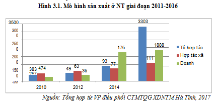Giai đoạn 2011-2016, tái cơ cấu ngành NNN đạt kết quả quan trọng, đưa tốc độ tăng trưởng giá trị sản xuất nông, lâm, thủy sản lên 7,96%. Tổng số mô hình sản xuất NN toàn Tỉnh hiện nay đạt doanh thu từ 100 triệu đồng/năm trở lên, có 3.303 Tổ hợp tác, 1.117 HTX, 1.888 DN trên địa bàn NT; một số sản phẩm NN chủ lực thu hút được DN lớn vào đầu tư, tăng nhanh về quy mô, chất lượng, từng bước phát triển chuỗi liên kết, như: Chăn nuôi bò chất lượng cao của Tổng Công ty Khoáng sản và Thương mại Hà Tĩnh, chăn nuôi bò giống và bò thịt chất lượng cao của Công ty Bình Hà (thuộc Tập đoàn Hoàng Anh Gia Lai), phát triển các cơ sở chăn nuôi lợn nái, cung ứng giống cho liên kết quy mô vừa và nhỏ; nuôi tôm thâm canh công nghệ cao,…