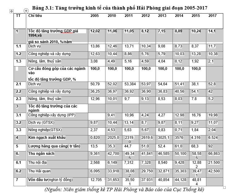 Hải Phòng là thành phố cảng, đầu mối giao thông quan trọng giao lưu trong nước và quốc tế, trung tâm công nghiệp, thương mại dịch vụ lớn của cả nước, nằm trong tam giác tăng trưởng Hà Nội-Hải Phòng- Quảng Ninh của vùng kinh tế trọng điểm phía Bắc. Với những tiềm năng, lợi thế về địa kinh tế lại được đánh giá là thành phố năng động trong sự nghiệp đổi mới, mở cửa kinh tế của thành phố trong 30 năm đổi mới đã có những bước tăng trưởng, phát triển khá cao. Chỉ tính trong giai đoạn 2005- 2017, kinh tế thành phố đã đạt được tốc độ tăng trưởng GRDP trên 10%/năm. Năm 2017 đạt 14,1%, cao nhất từ năm 2005 đến nay. Cụ thể như sau: