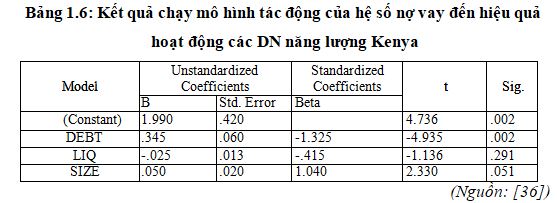 Nghiên cứu thực nghiệm được thực hiện bởi Mutwiri [38] với mục đích kiểm định mối quan hệ giữa cơ cấu nguồn vốn đến hiệu quả hoạt động DN của các DN niêm yết ngành năng lượng Kenya. Nghiên cứu được thực hiện đối với đối tượng là tất cả các DN niêm yết trên thị trường chứng khoán Nairobi thuộc ngành năng lượng tính đến ngày 31/12/2014 trong giai đoạn 10 năm kể từ năm 2004. Nghiên cứu sử dụng tỷ suất sinh lời vốn chủ sở hữu (ROE) làm biến đại diện cho hiệu quả hoạt động của DN. Để phân tích tác động của cơ cấu nguồn vốn đến hiệu quả hoạt động, nghiên cứu sử dụng các biến độc lập bao gồm: Hệ số nợ vay; Khả năng thanh toán và Quy mô DN.