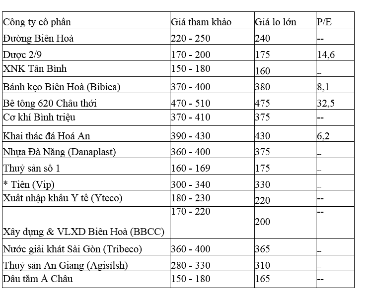 Bảng 1.1.: Giá tham khảo của một số cổ phiếu trên thị trường không chính thức.