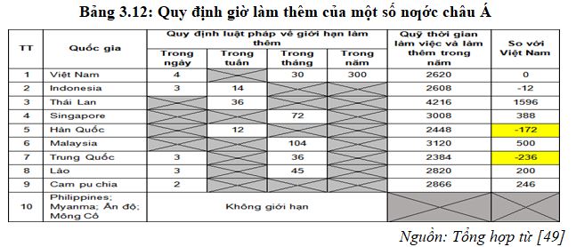 Mặc dù vậy, hệ thống pháp luật trên hiện nay còn một số bất cập như về HĐLĐ: khoản 2 Điều 3 – NSDLĐ là một bên quan trọng trong HĐLĐ chưa có hướng dẫn cụ thể ai sẽ là NSDLĐ trong các DN để ký HĐLĐ, ký kết TƯLĐTT; khoản 2 Điều 22 – khi kết thúc hợp đồng của NLĐ sau 30 ngày trở thành HĐLĐ xác định thời hạn 24 tháng hay HĐLĐ không xác định thời hạn; Điều 37 về quyền đơn phương chấm dứt HĐLĐ với điều kiện 1- Có lý do được quy định bởi luật là không phù hợp bởi NLĐ được tự do lựa chọn công việc; Về giờ làm việc tại Điều 106 – về thời gian làm thêm giờ theo tháng, theo năm quy định chưa phù hợp với các quốc gia khu vực. Trong khi đó so với các nước trong khu vực (xem bảng 3.12) số giờ làm thêm/năm: Thái Lan hơn 1596 giờ, Malaysia hơn 500 giờ, Singapore hơn 388 giờ. Đây là một quy định mà hầu hết DN may Việt Nam không thể tuân thủ được; Về tiền lương và phúc lợi tại Điều 91 quy định, mức lương tối thiểu phải bảo đảm nhu cầu sống tối thiểu của người lao động và gia đình họ. Làm cho DN khó thi hành vì thế nào là mức lương tối thiểu đảm bảo nhu cầu sống? và Điều 61 không quy định thời gian học nghề tối đa, mức lương, phúc lợi người học được hưởng dẫn tới NSDLĐ có thể lợi dụng để trốn đống BHXH; Về ATVSLĐ, theo Ông Bùi Đức Nhưỡng – Phó Cục trưởng Cục ATLĐ, (2018): “Trong công tác quản lý hoạt động kiểm định dẫn đến 1 đối tượng thiết bị, 1 kiểm định viên phải xin nhiều giấy chứng nhận đủ điều kiện hoạt động kiểm định từ nhiều bộ quản lý, ví dụ: Cẩu tháp do Bộ Xây dựng, Bộ LĐTBXH; bình áp lực do Bộ LĐTBXH, Bộ Công thương”. Điều này rất mất thời gian cho thực hiện ATVSLĐ của các DN may; Nghị định 47/2010NĐ-CP quy định mức phạt về vi phạm ATVSLĐ cao nhất là 20 triệu đồng đối với NSDLĐ và 1 triệu đồng đối với NLĐ. Mức phạt này liệu có đủ sức “răn đe” với những trường hợp vi phạm nghiêm trọng.