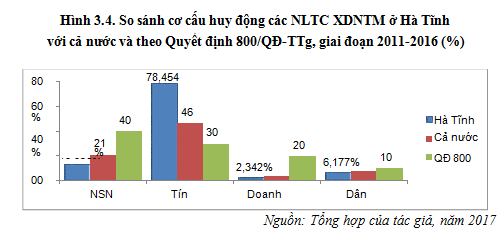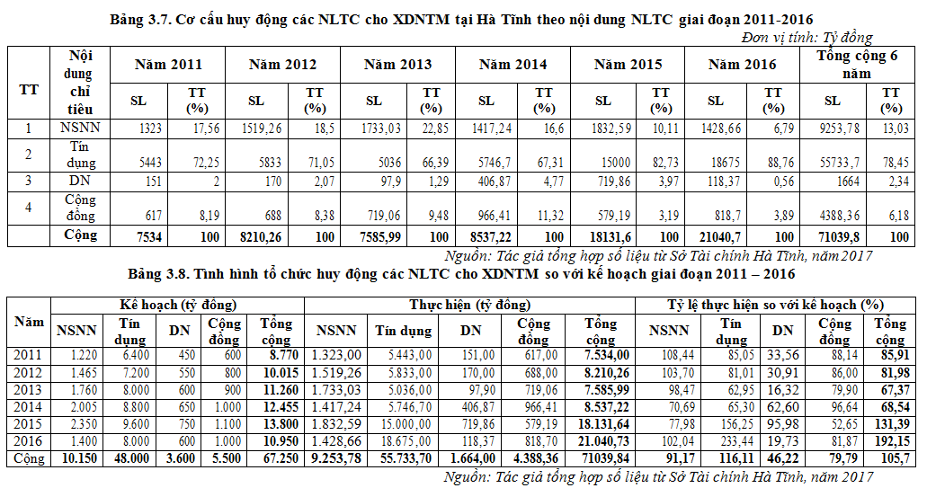 Theo kết quả tổng hợp tại Bảng 3.5, so với kế hoạch đề ra, tổng số NLTC đã huy động và sử dụng cho XDNTM tại Hà Tĩnh trong giai đoạn 2011 – 2016 đạt 105,7% so với kế hoạch, trong đó vốn NSNN đạt 91,17% so với kế hoạch; NLTC từ tín dụng đạt 116,11% so với kế hoạch; NLTC từ DN đạt 46,22% và nguồn huy động từ cộng đồng dân cư đạt 79,79% kế hoạch. Những kết quả đạt được kể trên đã nói lên sự đúng đắn, linh hoạt trong lãnh đạo, điều hành của chính quyền các cấp của tỉnh Hà Tĩnh đối với các NLTC cho XDNTM.