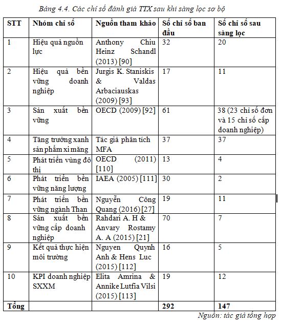 Trên cơ sở bộ tiêu chí đã được tổng hợp (Bảng 4.3) và 7 tiêu chí đánh giá TTX và các nguồn dữ liệu khác (mục 4.1), tiến hành sàng lọc từng chỉ số để giữ lại những chỉ số phù hợp nhất. Quá trình sàng lọc thực hiện qua 3 căn cứ (đã xác định ở chương 3): (1) xác định một cách phù hợp với các mục tiêu và chính sách về chất lượng, môi trường, và an toàn sức khỏe nghề nghiệp của doanh nghiệp SXXM; (2) bên trong phạm vi doanh nghiệp SXXM; và (3) trong phạm vi các tiêu chí/khía cạnh đã được xác định của TTX. Các chỉ số không đáp ứng được các yêu cầu trên sẽ bị loại ra. Việc lựa chọn các chỉ số đảm bảo thỏa mãn 3 căn cứ trên và loại bỏ các chỉ số không thỏa mãn một trong ba căn cứ đó và những chỉ số thuộc nhóm xã hội hoặc liên quan đến vấn đề xã hội (từ các nguồn chỉ số) sẽ bị loại bỏ. Các chỉ số bị loại bỏ khi thuộc một trong các nguyên nhân sau: