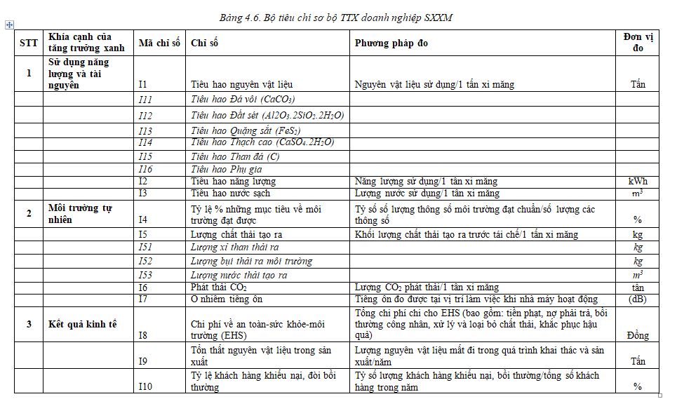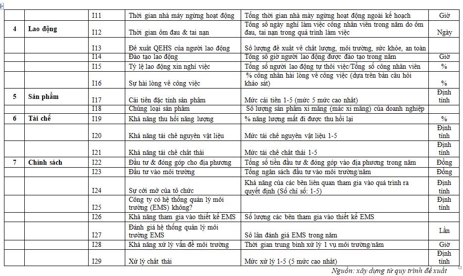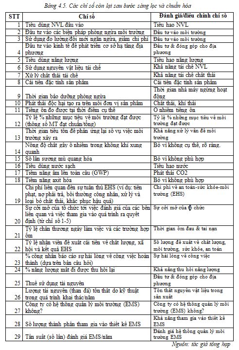 Tiếp tục rà soát, đánh giá từng chỉ số trong 42 chỉ số còn lại; chuẩn hóa đơn vị đo lường/phạm vi cho phù hợp với phạm vi trong doanh nghiệp SXXM (thể hiện ở cột “Đánh giá” trong phụ lục 3) đồng thời xác định phương pháp đo lường các chỉ số đó. Kết quả loại bỏ thêm 13 chỉ số; tổng hợp lại và khái quát hóa còn 29 chỉ số (Bảng 4.5):