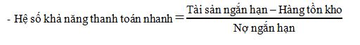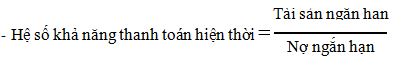Hệ số này phản ánh tính chặt chẽ hơn đối với khả năng thanh toán của DN cho thấy khả năng DN sử dụng tiền và các tài sản có tính thanh khoản cao nhất để đảm bảo đối với các khoản nợ ngắn hạn. Hệ số này đã loại trừ hàng tồn kho do trong cơ cấu tài sản ngắn hạn, hàng tồn kho được coi là loại tài sản khó khăn khi chuyển đổi thành tiền hay có tính thanh khoản thấp.
