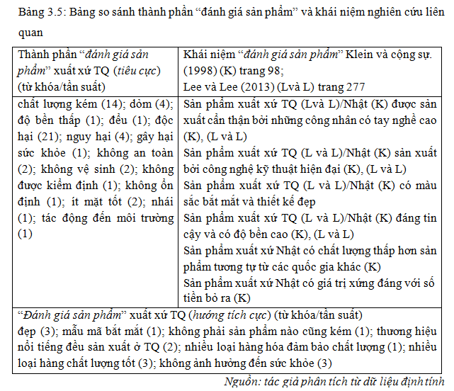 Thành phần “đánh giá sản phẩm” nguồn gốc TQ dựa tɾên ý kiến của người tiêu dùng Việt cho thấy hai khuynh hướnɡ trái ngược nhau gồm hướnɡ nhận xét tiêu cực và tích cực. Nội dung thành phần “đánh giá sản phẩm” theo hai hướnɡ gồm những nội dung gắn với những từ khóa ở bảng minh họa 3.5.