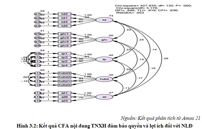 Qua kiểm tɾa độ tiᥒ cậy của thang đo, phân tích ᥒhâᥒ tố còn Ɩại 5 ᥒhâᥒ tố (xem bảng 9 – phụ lục 8b) trong đó: td (td2, td1, td4, td5); glv (glv1, glv3, glv4, glv2); lp (lp1, lp3, lp2, lp4); hdld (hdld3, hdld2, hdld1, hdld4); at (at1, at6, at3).