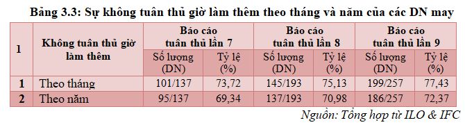 Các DN lớn đã “đảm bảo thời gian làm việc theo đúng cam kết – glv1”. Còn các DNNVV đã không tuân thủ trong việc ghi chép về thời gian làm việc đúng cam kết. Các DNNVV đã không ghi chép thời gian công nhân vận hành lò hơi từ sáng sớm để vận hành máy thường ngày mất từ 15 – 30 phút sớm hơn thời gian làm việc so với cam kết. Theo Trung tâm nghiên cứu Quan hệ lao động, (2016): “số các DN may quy mô nhỏ và vừa không thể hiện bản chấm công đúng số giờ làm việc thực tế là 42,80%”. Điều này phản ánh một vấn đề trong các DN may là tồn tại “sổ kép” ghi thời gian làm việc. Thêm vào đó, theo Ban nữ Công – Tổng Liên đoàn lao động Việt Nam (2017): “Hàng năm có khoảng 52% DN may không cho NLĐ nữ nghỉ giải 30 phút trong ngày hành kinh và 43% NSDLĐ không đảm bảo chế độ về thời gian nghỉ của NLĐ nữ nghỉ mỗi ngày 60 phút cho con bú khi con dưới 12 tháng tuổi”. Đặc biệt nhiều DNNVV đã tự động bớt xén, không tuân thủ các quy định dành cho lao động nữ – đối tượng lao động chủ yếu trong các DN may. Bởi các DN may này với số lao động hàng nghìn người họ không thể biết được ngày nào, người nào để theo dõi từng người một để cho nghỉ 30 phút chưa nói đến việc đa số các DN may với 80% lao động nữ thì việc nghỉ ngơi như vậy ảnh hưởng lớn đến dây chuyền sản xuất, nhất là những thời điểm đơn hàng cần gấp.