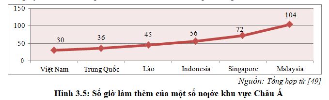 Mối quan tâm liên quan đến làm thêm giờ tập trung chủ yếu là “đảm bảo số giờ làm thêm theo tháng và theo năm – glv3 và glv4”. Đây là hai nội dung có mức đánh giá thực trạng thấp nhất tại các DN lớn và DNNVV. Điều 106 Bộ luật lao động (2012) quy định: “giới hạn làm thêm giờ hàng tháng là không quá 30 giờ và một năm là không quá 200 giờ”. Tuy nhiên các DN may là điển hình của việc làm thêm giờ quá mức quy định. Theo Viện công nhân công đoàn, (2017): “Thời gian làm thêm giờ trung bình của NLĐ là 47 – 60 giờ/tháng và làm thêm giờ lên tới 500 giờ/năm, thậm chí 600 giờ/năm”. Việc làm thêm giờ quá nhiều có đảm bảo NLĐ có sức khỏe tốt cho NLĐ đặc biệt là NLĐ nữ hay không? Bởi NLĐ nữ có gia đình còn phải có thời gian dành cho gia đình, chăm sóc con cái sau giờ làm việc còn đối với nữ lao động chưa có gia đình thì ít có điều kiện, thời gian gặp gỡ, tìm hiểu bạn khác giới. Nội dung làm thêm giờ theo tháng, năm được xem là thách thức lớn nhất và dai dẳng nhất của cả DN lớn và DNNVV. ILO & IFC (2015) đã nghi nhận tình trạng vi phạm Luật của các DN may (xem bảng 3.3). Tuy nhiên thống kê của MOLISA (2017) so với quy định 30 giờ/tháng của Việt Nam thì số giờ làm thêm theo tháng thấp hơn rất nhiều so với khu vực (xem hình 3.5). Câu hỏi đặt ra là để tăng tính cạnh tranh của thị trường lao động Quốc hội, Chính phủ nên xem xét PLLĐ liên quan về giờ làm thêm.