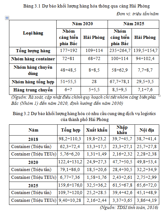 Hải Phòng là thành phố cảng cửa ngõ quốc tế của vùng KTTĐ Bắc Bộ nên khối lượng hàng hóa thông qua cảng biển Hải Phòng sẽ quyết định tới khối lượng hàng hóa có nhu cầu cung ứng dịch vụ logistics của thành phố (bên cạnh lượng hàng hóa tiêu dùng nội địa,…). Dự báo khối lượng hàng hóa thông qua cảng biển Hải Phòng đã được nghiên cứu trong rất nhiều các quy hoạch có liên quan như điều chỉnh quy hoạch phát triển hệ thống cảng biển Việt Nam đến năm 2020, định hướng đến năm 2030 (phê duyệt tại quyết định số 1037/QĐ–TTg ngày 24/6/2014); Quy hoạch chi tiết nhóm cảng biển phía Bắc (nhóm 1) giai đoạn đến năm 2020 định hướng đến năm 2030 (phê duyệt tại quyết định số 2367/QĐ–BGTVT ngày 29/7/2016); thiết kế chi tiết hệ thống cảng cửa ngõ quốc tế Hải Phòng (cảng Lạch Huyện),…