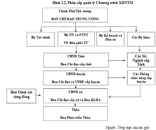 CTMTQG về XDNTM được “điều hành và thực hiện theo phương thức phân cấp bao gồm 4 cấp: Trung ương, Tỉnh, Huyện, Xã”[108]. Bộ máy quản lý điều hành CTMTQG XDNTM được thành lập từ Trung ương đến cơ sở (tỉnh, huyện, xã, thôn), gồm: