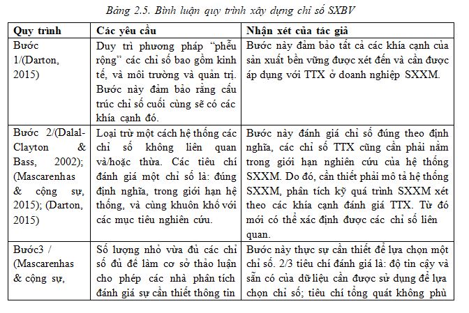 Đa số các nghiên cứu xây dựng chỉ số đánh giá không chỉ rõ phương pháp mang tính hệ thống và logic cao được sử dụng là gì. Mặc dù, nghiên cứu của Rahdari A. H & Anvary Rostamy A (2015) [21] đưa ra một phương pháp mang tính hệ thống trong việc xây dựng chỉ số sản xuất bền vững; tuy nhiên lại là bộ chỉ số bền vững mang tính tổng quát chung, chưa thực hiện cho một ngành cũng như doanh nghiệp cụ thể nào. Mặc dù vậy, quy trình của Rahdari và cộng sự có thể là tài liệu tham khảo tốt sử dụng cho việc xây dựng bộ chỉ số đánh giá TTX mà luận án kế thừa.