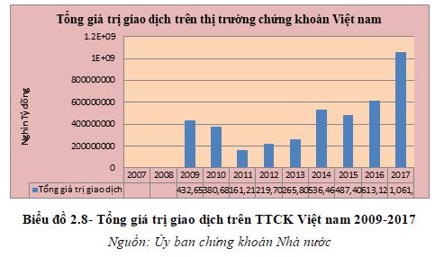 Tuy nhiên, trong khoảng thời gian từ 2011-2014, nhiều nhà đầu tư bán tháo cắt lỗ trên thị trường, một số nhà đầu tư khác vẫn tiếp tục duy trì mua bán khối lượng nhỏ và giá trị giao dịch thấp để tìm kiếm lợi nhuận từ thị trường. Năm 2014 tổng giá trị giao dịch được phục hồi với tổng giá trị giao dịch là 536.400 tỷ đồng, giảm nhẹ trong năm 2015, 2016 và đạt mức 1.061.000 tỷ đồng vào năm 2017.