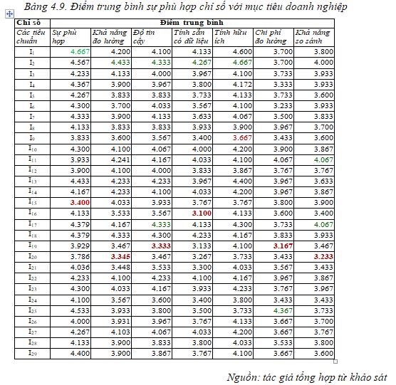Bảng 4.9 cho thấy điểm số trung bình của mỗi chỉ số theo các tiêu chuẩn: